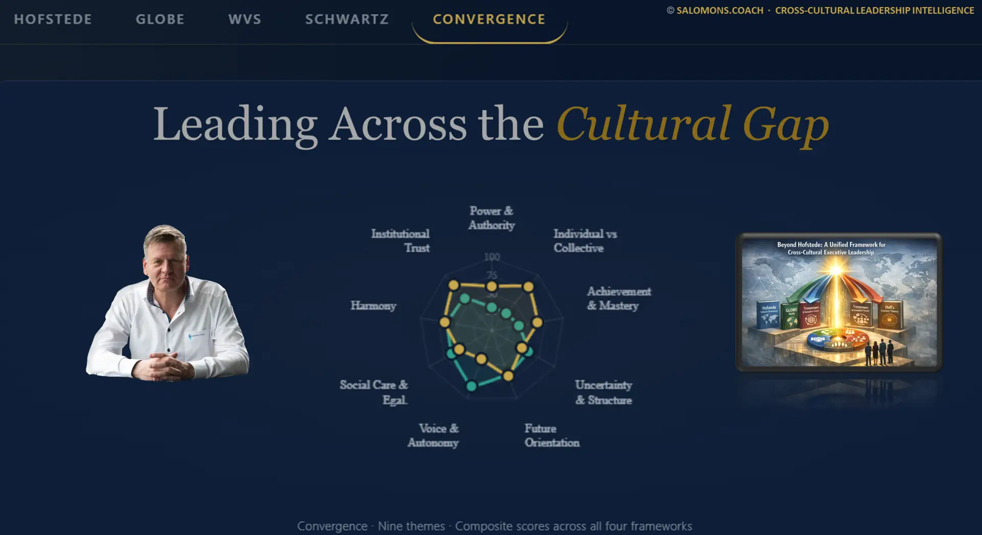 The Cross-Cultural Leadership Compass, developed by Salomons.Coach, is built around exactly this challenge. It is not a personality test. It is not a cultural tourism guide. It is a structured analytical tool that maps the structural distance between two national professional cultures across four independently validated academic frameworks: Hofstede, GLOBE, the World Values Survey, and Schwartz, and translates that data into eleven specific leadership dimensions where the cultural gap plays out in practice.