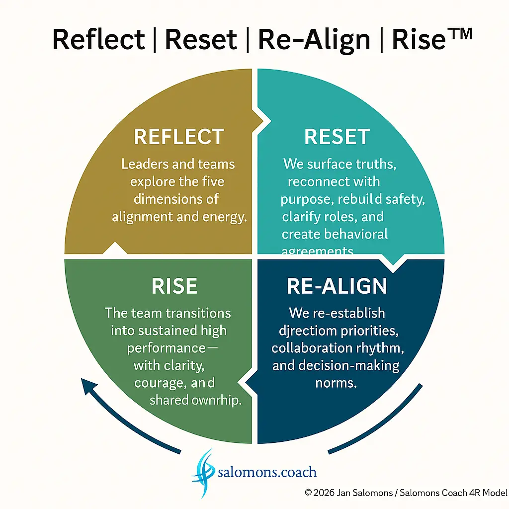 That insight led me to develop the 4R Model™ — Reflect | Reset | Re-Align | Rise, a practical framework for helping teams rebuild reflection, trust, and coherence in complex systems.